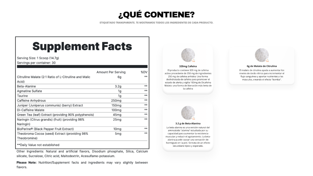 - 320mg de cafeína para una energía de larga duración para tus entrenamientos más duros